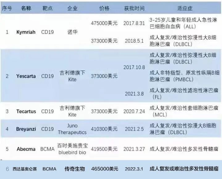 美國上市的6款CAR-T療法