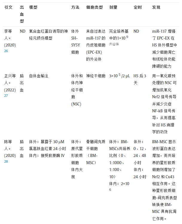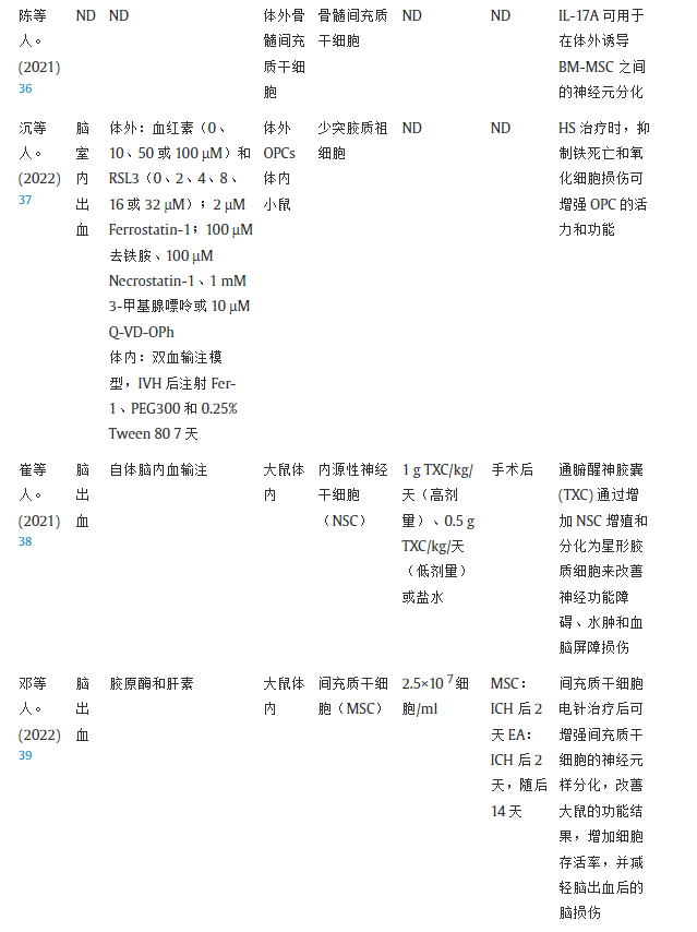 表1:該表舉例說明了有關(guān)使用干細(xì)胞治療出血性中風(fēng)的研究。(ND=未描述)。