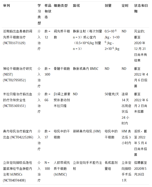 表2:該表舉例說明了2020年至2022年期間通過在ClinicalTrials.gov上搜索“出血性中風(fēng)”或“ICH”或“腦出血”和“干細(xì)胞”找到的臨床試驗(yàn)更新。(ND=未描述)。