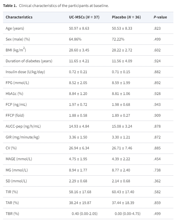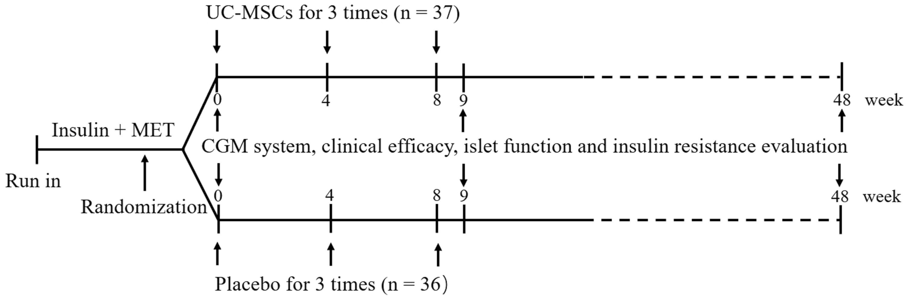2015年10月至2018年12月期間,73名受試者(年齡在20至65歲之間,體重指數為24-40kg/m2,空腹C肽水平≥1ng/mL,HbA1c水平在7.0%至12.0%之間)接受治療納入穩定胰島素0.5-1.0U/kg/天和二甲雙胍治療≥3個月)且患有T2D不足20年的患者。n=37) 或相同體積和外觀的安慰劑 ( n=36) 在肘關節處3次,間隔4周。本研究使用4代UC-MSCs,每次輸注UC-MSCs總數為1×106/kg。