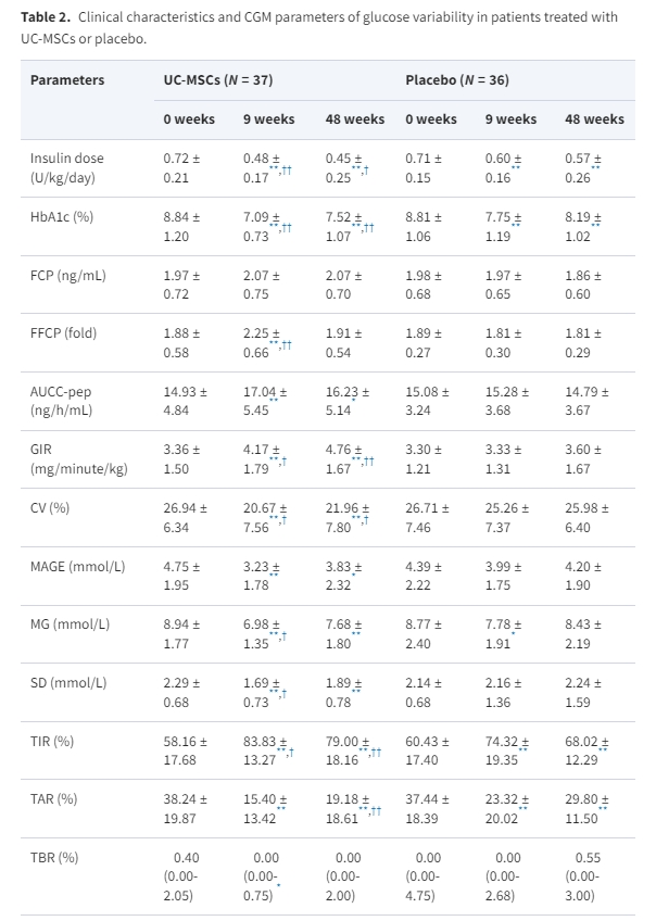 第9周時,與基線相比,臍帶-間充質干細胞組的CGM參數(CV、MAGE、MG、SD、TIR和TAR)顯著改善,TBR降低。安慰劑組的MG、TIR)和TAR與基線相比有明顯改善,而CV、MAGE、SD和TBR沒有變化(表2)。