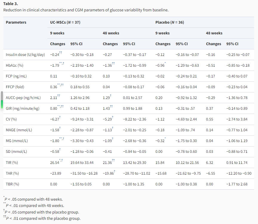 我們比較了兩組間CGM參數從基線到第9周和第48周的變化。與安慰劑組相比,臍帶-間充質干細胞組在第9周時的CV、MAGE、MG、SD和TIR以及第48周時的CV、MAGE、MG、TIR和TAR(表3)均有更明顯的改善。