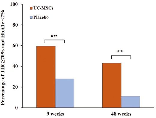 與安慰劑組相比,UC-MSCs組在第9周和第48周達到TIR≥70%和 HbA1c<7%的血糖控制目標的患者數量多于安慰劑組(59.5%vs. 27.8%和43.2%vs11.1%)如圖2。