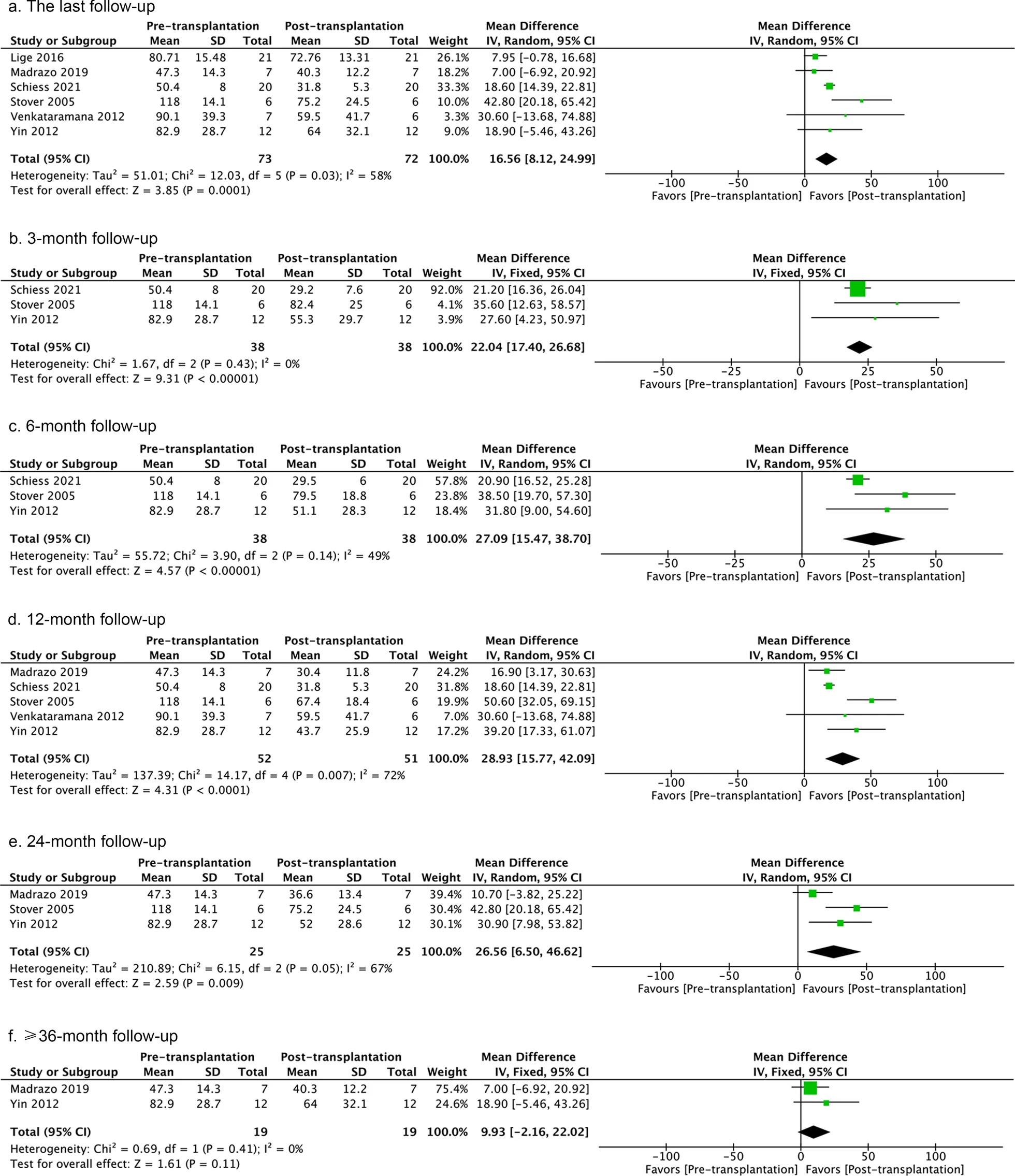 沒有研究調查細胞療法的效果是否受到患者性別的影響。所有納入的研究均具有同等的男女比例,平均病程超過5年。平均年齡在47.2歲至66.4歲之間。薈萃分析中包含的六項研究明確表明,入組患者對多巴胺能治療有積極反應。五項研究沒有具體說明左旋多巴反應性。在“關閉”狀態下的UPDRS評分分析中,左旋多巴反應患者的比例在3-、6-、12-、24-和≥時分別為100%、100%、86.5%、100%和100%36個月隨訪率和末次隨訪率分別為61.6%(圖2)。