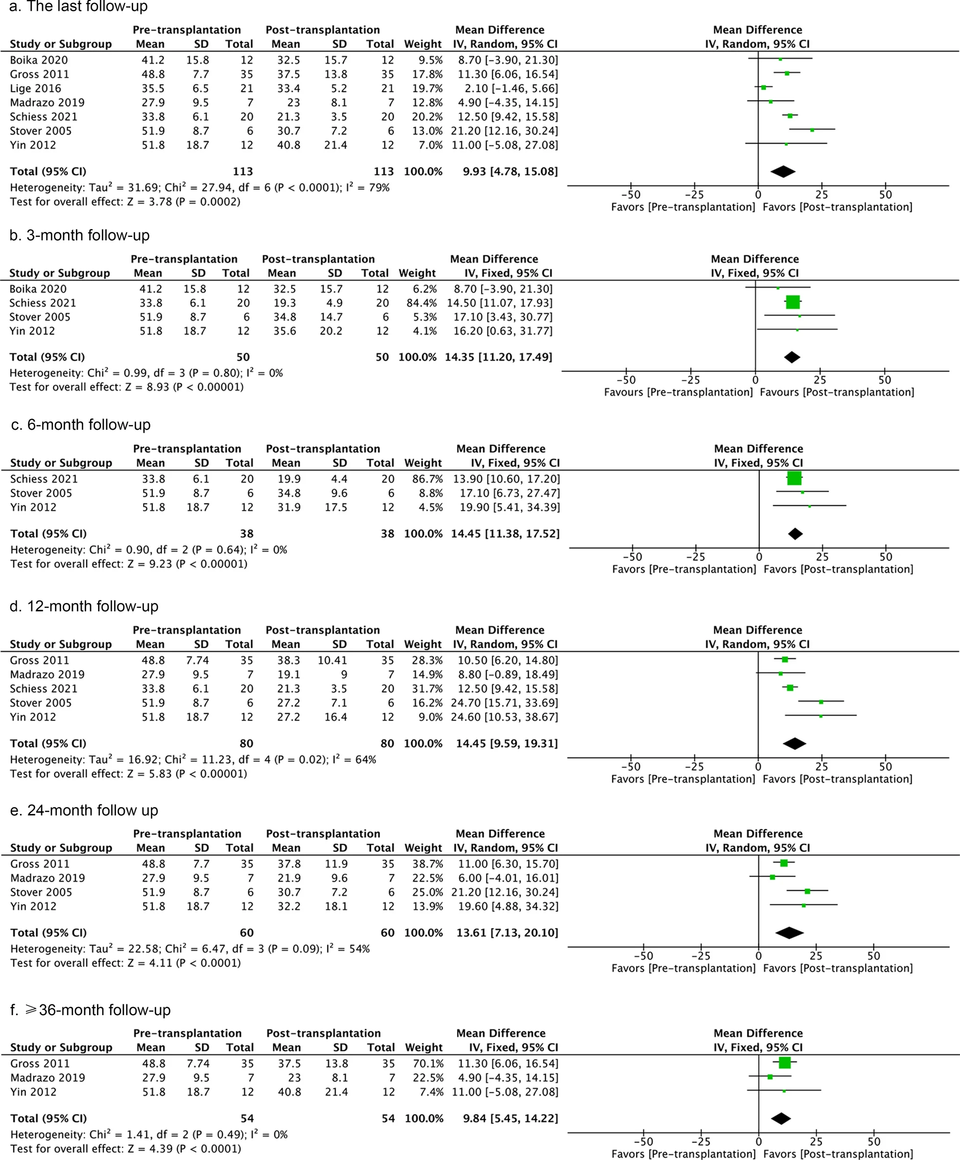 在3、6、12、24和≥36個月的隨訪中,對處于“關閉”狀態的細胞處理后的UPDRSIII評分進行分析,結果顯示出積極的效果。分析“開啟”狀態下的UPDRSIII評分顯示,與基線狀態相比,干細胞治療在6個月和24個月的隨訪中具有有益效果,但在最后一次隨訪以及3個月或12個月的隨訪中都沒有效果(圖4)。最后一次隨訪以及3、6和24個月隨訪時研究間異質性較低(圖4)。12個月的隨訪顯示出高度異質性。