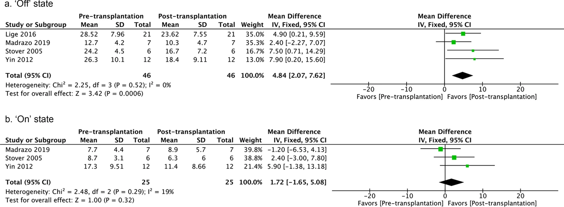 使用UPDRSII或Schwab和England評分評估ADL。四項研究檢查了最后一次隨訪時處于“關閉”狀態的UPDRSII評分。固定效應模型顯示同質細胞治療后有更好的結果。三項研究評估了“開啟”狀態下的 UPDRSII 評分(全部使用同種異體細胞),但沒有報告治療效果。沒有明顯的異質性(圖5)。