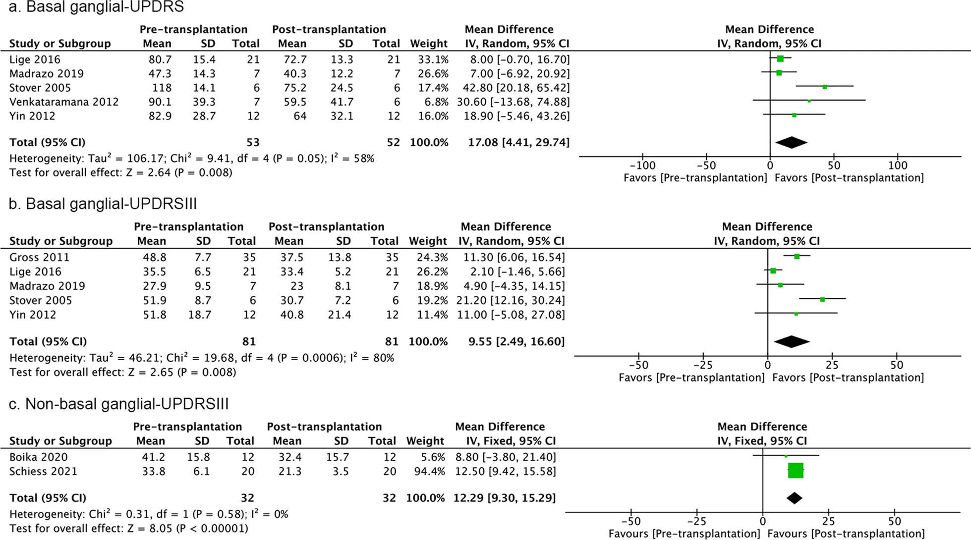 自體干細胞移植并不能改善功能結果,而同種干細胞移植則表現出有益的效果。令人鼓舞的是,移植到基底神經節和基底神經節以外的區域都可以有效降低疾病的嚴重程度。一些試驗報告了可能與外科手術相關的不良事件。本薈萃分析中包含的兩項試驗報告了1例確診病例和4例可能的移植物引起的運動障礙病例。