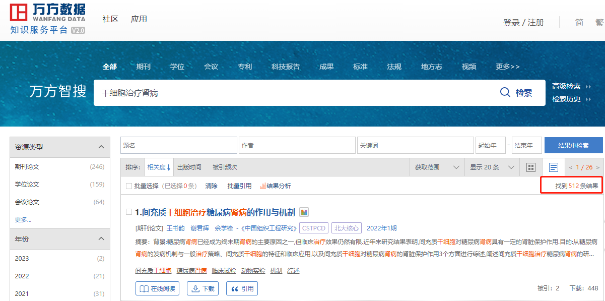 與此同時,在萬方數據通過“干細胞治療腎衰竭”關鍵詞檢索相關文獻,最終結果顯示有關干細胞治療腎病的基礎研究與臨床研究合計多達512條。