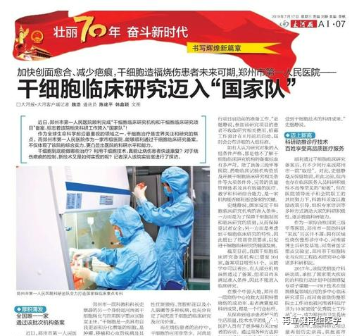 2019年,CCTV央視網曾于《壯麗70年 奮斗新時代》慶祝建國70周年的專題欄目中收錄了河南大河報一篇名為《加快創面愈合、減少疤痕,干細胞造福燒傷患者未來可期,鄭州市第一人民醫院——干細胞臨床研究邁入“國家隊” 》的報道。