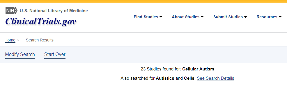 2023年5月,使用搜索詞 “自閉癥譜系障礙和細(xì)胞療法 “對美國NIH臨床試驗數(shù)據(jù)庫(clinicaltrials.gov)進(jìn)行了搜索,發(fā)現(xiàn)了23項。