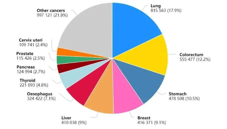 據(jù)世衛(wèi)癌癥研究數(shù)據(jù),2020年中國(guó)新發(fā)癌癥病例達(dá)到了457萬(wàn)例。前五的癌癥為:肺癌82萬(wàn),結(jié)直腸癌56萬(wàn),胃癌48萬(wàn),乳腺癌42萬(wàn),以及肝癌41萬(wàn),這五種癌癥已經(jīng)占據(jù)了近半數(shù)。為中國(guó)的癌癥預(yù)防和治療帶來(lái)了巨大的挑戰(zhàn)。