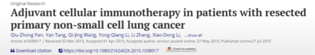 中山大學(xué)腫瘤中心等研究機(jī)構(gòu)在《腫瘤免疫學(xué)(OncoImmunology)》雜志上發(fā)表的“原發(fā)性非小細(xì)胞肺癌(NSCLC)切除患者的輔助細(xì)胞免疫治療”文章揭示了原發(fā)性非小細(xì)胞肺癌(NSCLC)患者接受細(xì)胞因子誘導(dǎo)的殺傷(CIK)細(xì)胞免疫療法的顯著效果。