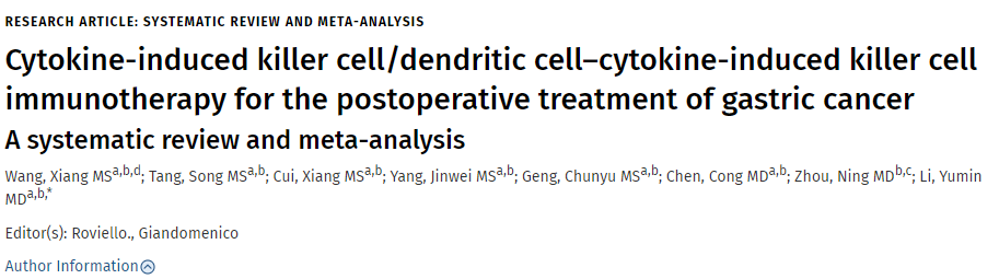 2017年蘭州大學(xué)第二醫(yī)院的研究團(tuán)隊(duì)發(fā)表在《醫(yī)學(xué)》上共納入了1216名胃癌患者的薈萃分析中,化療聯(lián)合CIK/DC-CIK治療相較于傳統(tǒng)治療,顯著提高了患者的生存質(zhì)量和總體生存率。