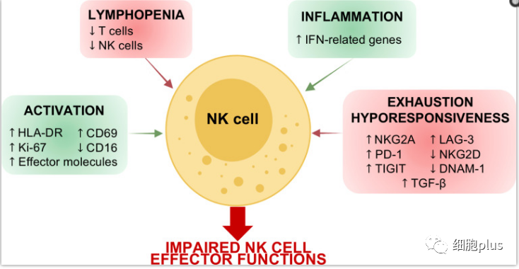 由于局部和全身炎癥,新冠肺炎患者中的NK細胞的特征在于歸因于細胞活化和炎癥以及細胞衰竭和低反應性的信號。NK細胞表型的這些改變決定了在IFN-γ和TNF-α產生、脫粒溶細胞潛力和控制病毒復制能力方面NK細胞效應子功能的損傷。