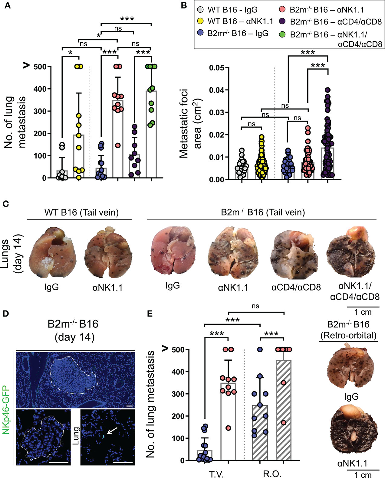 在本項研究中,作者利用B16轉移性黑色素瘤模型來證明NK細胞如何與T細胞合作來減少肺部轉移性腫瘤負擔。