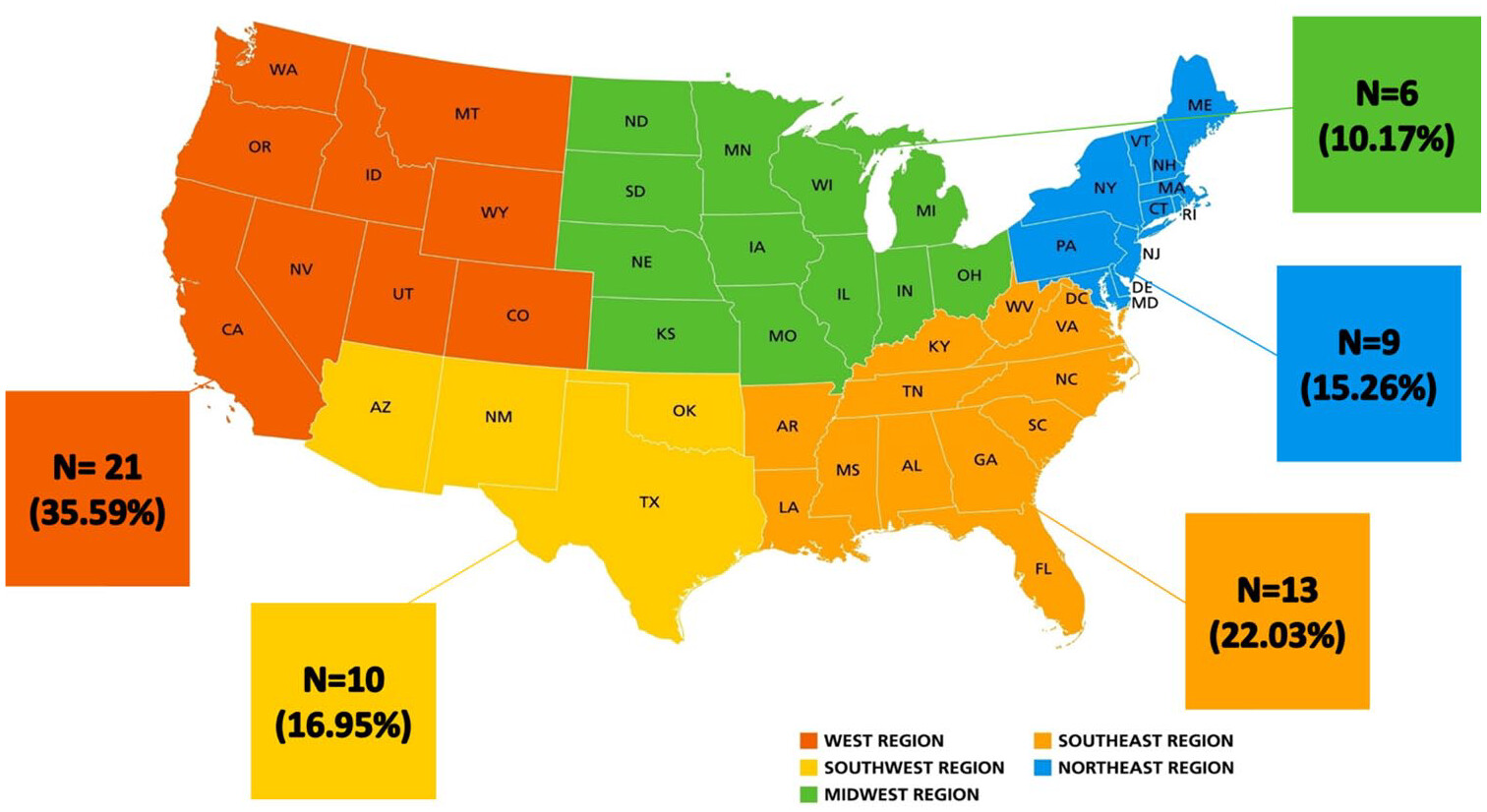我們進行了在線搜索,以確定美國提供SCT作為ED治療選擇的中心。然后繪制了一張地圖來展示所有這些中心在全美的地理分布(圖1)。