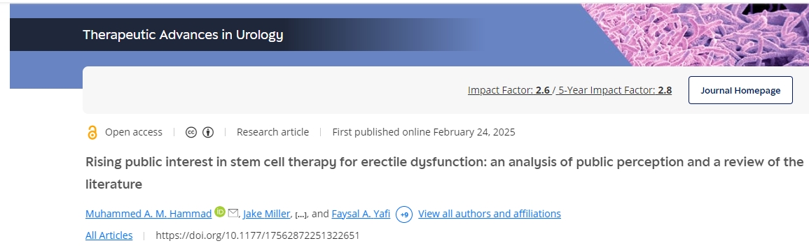參考資料:[1]:Hammad MAM, Miller J, Sultan MI, et al. Rising public interest in stem cell therapy for erectile dysfunction: an analysis of public perception and a review of the literature. Therapeutic Advances in Urology. 2025;17. doi:10.1177/17562872251322651
