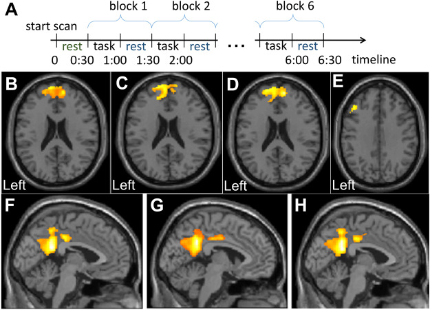 (A)fMRI 數(shù)據(jù)共分為6個(gè)區(qū)塊,每個(gè)區(qū)塊由雙任務(wù)和休息期組成。 丟棄第一個(gè)休息期(綠色表示)以確保達(dá)到T1平衡。 (B)治療前患者左額葉皮質(zhì)的失活區(qū)-言語工作記憶環(huán)路前部成分的一部分。 失活簇包括Brodmann區(qū)9和10。(C) 干細(xì)胞注射后患者左右額葉皮質(zhì)的失活區(qū)和(D)相應(yīng)的差異圖像顯示失活體積顯著減少(P?<0.001)。(E) 治療后,Brodmann 區(qū) 9 的部分額葉皮質(zhì)變?yōu)榧せ顓^(qū)。(F)左后扣帶回左側(cè)邊緣葉失活區(qū)治療前和治療后(G)體積均無變化(P?>0.05)。(H)然而,差值圖像顯示其定位發(fā)生了變化。