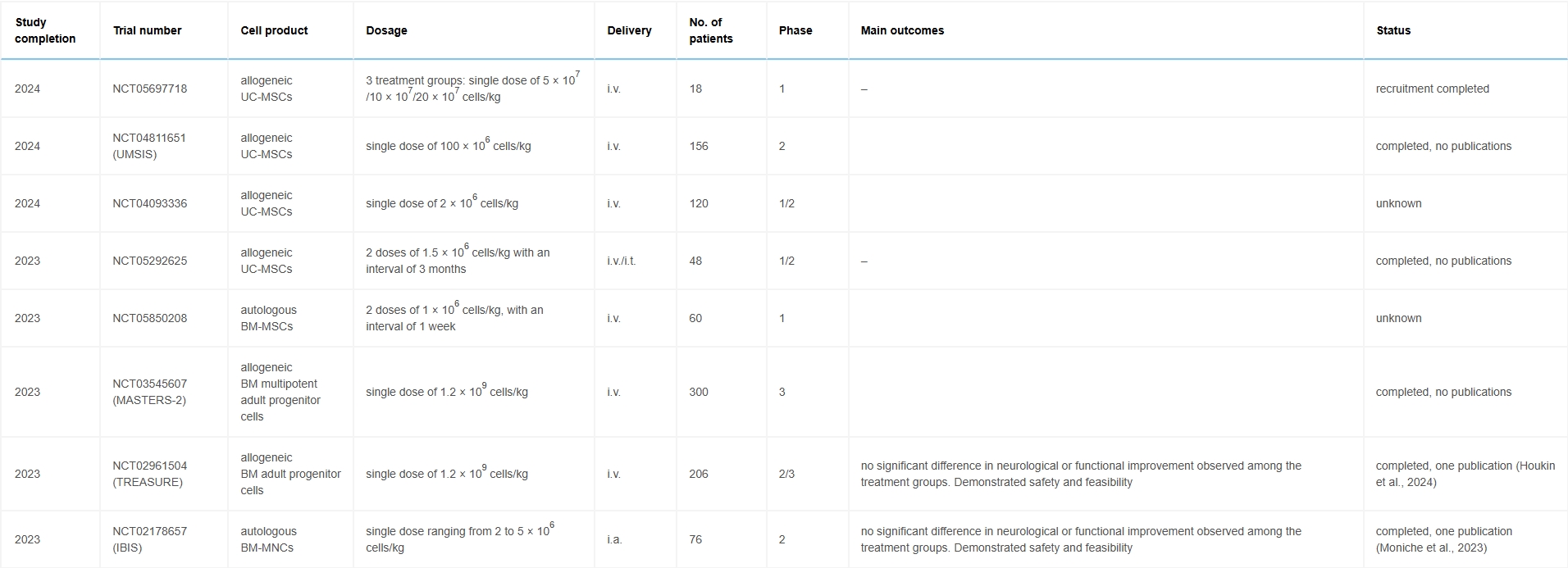 迄今為止,僅在2024年期間開展過一項Ⅱ/Ⅲ期試驗——TREASURE研究,該研究評估了靜脈注射骨髓源性多潛能成體祖細胞對缺血性卒中患者的療效。