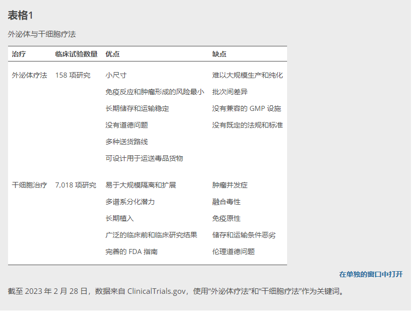 至少有150項臨床試驗已在ClinicalTrials.gov上注冊,研究基于外泌體的療法治療多種疾病,包括呼吸道疾病、傳染病和癌癥(在 www.clinicaltrials.gov上使用“外泌體療法”作為關鍵詞搜索)。在這些試驗中,31項應用源自干細胞(主要是來自不同組織的間充質干細胞)的外泌體,并作為間充質干細胞療法的替代方案進行測試。這些臨床前和臨床研究表明,干細胞釋放的外泌體可能部分重現其供體細胞的治療效果,而沒有干細胞治療固有的缺點(表1)。