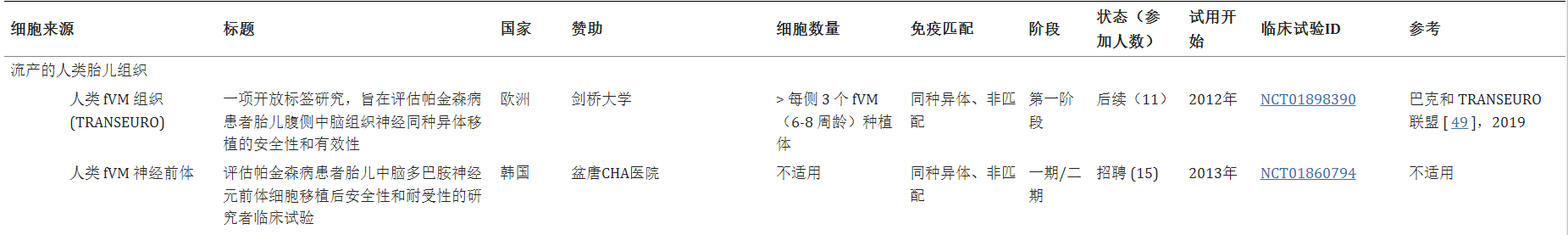 Lindvall等人于20世紀80年代初進行的開放標簽研究。首先表明,將從胎齡8-9周流產(chǎn)的人類胚胎中獲得的人類胎兒中腦多巴胺能神經(jīng)元移植到PD患者的紋狀體中,可以在人腦中存活,并導致嚴重僵硬、運動遲緩、以及患者病情的波動。這可能是通過恢復紋狀體多巴胺能傳遞而發(fā)生的,揭示了使用胎兒組織進行細胞移植治療的前景。