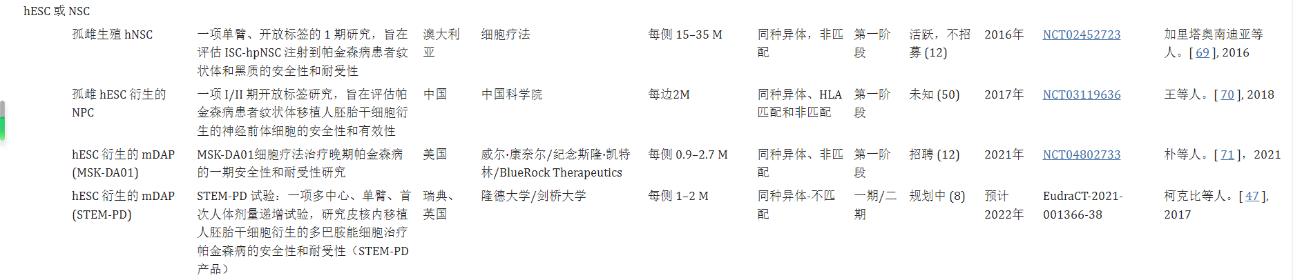 截至撰寫本文時,已有四項注冊臨床試驗使用 hESC 衍生的多巴胺細胞或人孤雌生殖神經(jīng)干細胞作為移植治療的同種異體細胞來源(表格1)。其中,王等人于2017年啟動了第一個使用hESC的臨床試驗(NCT03119636)。基于最近的臨床前動物研究,美國Studer小組開展了一項1期臨床試驗,以確定同種異體WA09 hESC衍生的mDA祖細胞 (mDAP) (MSKDA01) 治療晚期PD患者的安全性和有效性 (NCT04802733)?。