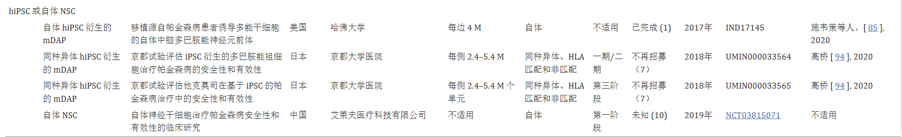 盡管歷史較短,但使用基于自體hiPSC的個性化細胞療法的治療益處是顯而易見的。首個評估自體hiPSC衍生細胞潛力的臨床試驗由日本小組于2014年發(fā)起。曼代等人首先將自體hiPSC來源的視網(wǎng)膜色素上皮(RPE)移植到視網(wǎng)膜下患有晚期新生血管性年齡相關性黃斑變性的患者中,據(jù)報道該治療可改善患者的視力,證明了自體細胞療法的潛力。截至撰寫本文時,已經(jīng)開展了3項使用hiPSC衍生細胞治療PD患者的臨床試驗(表格1)。