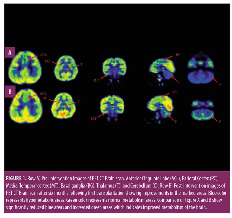 七個(gè)月后進(jìn)行了隨訪,根據(jù)客觀量表和腦部PET CT掃描重新評(píng)估了患者干預(yù)后的臨床變化。基于他的整體改善,他接受了第二次BMMNC移植以進(jìn)一步促進(jìn)康復(fù)。鞘內(nèi)施用大約5.12×108個(gè)存活率98%的BMMNC,發(fā)現(xiàn)CD34+細(xì)胞為0.014%。第二次移植后九個(gè)月進(jìn)行了另一次隨訪。