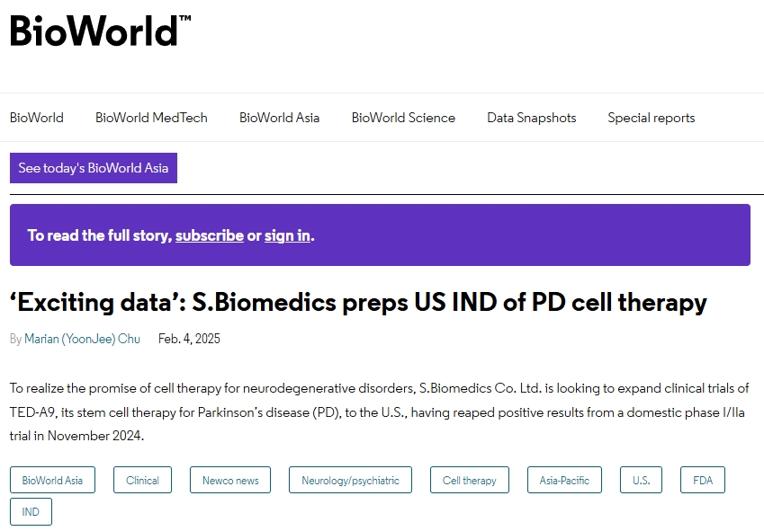 此外,據(jù)生物世界2025年2月14號網(wǎng)站報道,由于TED-A9治療帕金森病,產(chǎn)生了“令人興奮的數(shù)據(jù)”。為了實現(xiàn)細胞療法治療神經(jīng)退行性疾病的前景,S.Biomedics準備在美國申請PD細胞療法新藥。