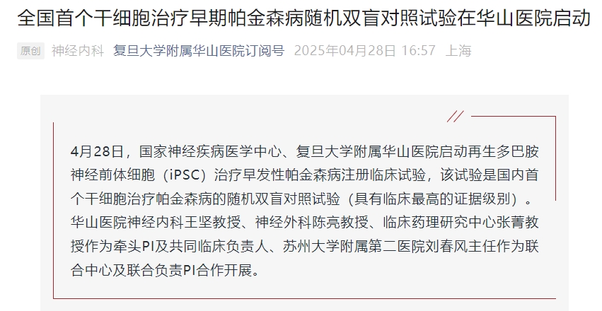 4月28日,國家神經疾病醫學中心、復旦大學附屬華山醫院啟動再生多巴胺神經前體細胞(iPSC)治療早發性帕金森病注冊臨床試驗,該試驗是國內首個干細胞治療帕金森病的隨機雙盲對照試驗(具有臨床最高的證據級別)。[9]