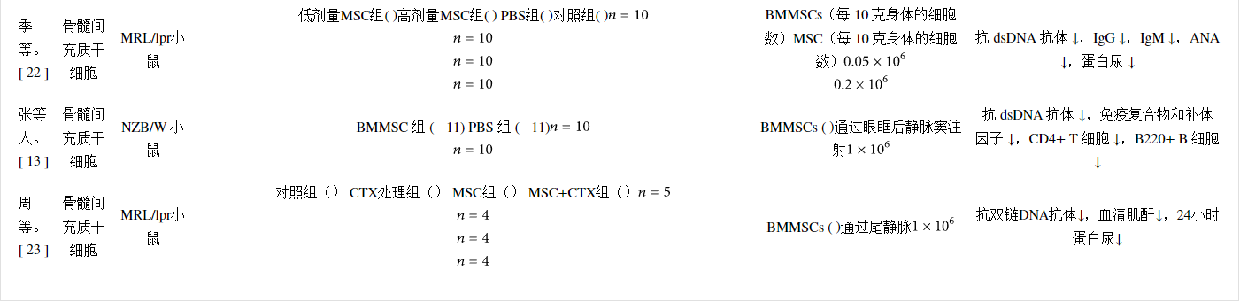 梁等評估了15名接受MSC治療(骨髓間充質干細胞 (BMMSCs))的難治性SLE患者的血清指標和腎功能。后續研究表明,15名患者中有11名患者的血清抗dsDNA抗體水平在移植后1個月和3個月均降至基線以下。除一名患者外,幾乎所有患者的24小時蛋白尿在1周時顯著下降2538.0±382.3±至1430.7±306.3mg并在1、3、6和12個月的隨訪中進一步持續下降。