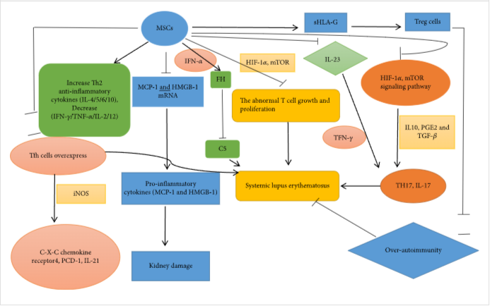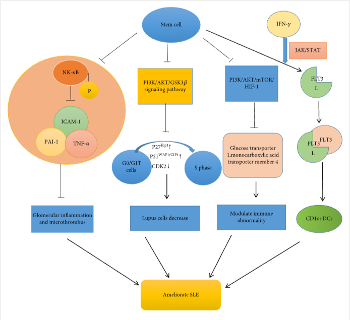 SLE 的干細胞療法與信號通路相關,例如NF-κB、STAT和 Akt/GSK3 β信號通路,這些信號通路與下游炎癥介質的合成有關以及T細胞的調節,包括Th1、Th2、Treg和Tfh細胞。