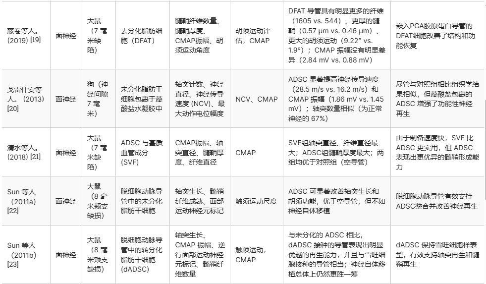 髓鞘化纖維數(shù)量變化:五篇面神經(jīng)研究(占41.7%)通過定量分析發(fā)現(xiàn),ADSC干預(yù)后髓鞘化纖維數(shù)量顯著高于對照組(實驗組:1026-2736根;對照組:543-1700根)。