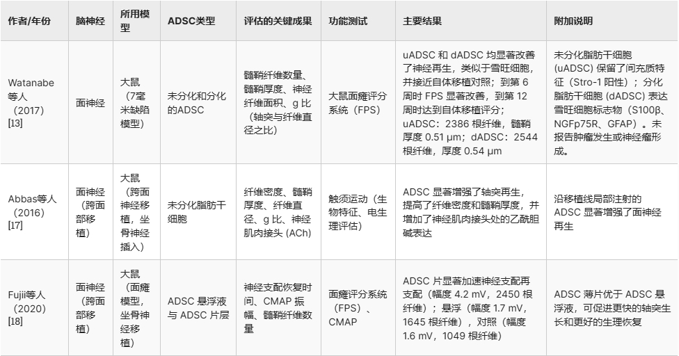 結(jié)論:脂肪干細(xì)胞(ADSC)作為神經(jīng)再生的潛在治療手段,其價值在長期研究中得到認(rèn)可。本綜述綜合現(xiàn)有證據(jù)(盡管以動物研究為主)表明,ADSC治療能有效促進顱神經(jīng)的結(jié)構(gòu)和功能恢復(fù)。