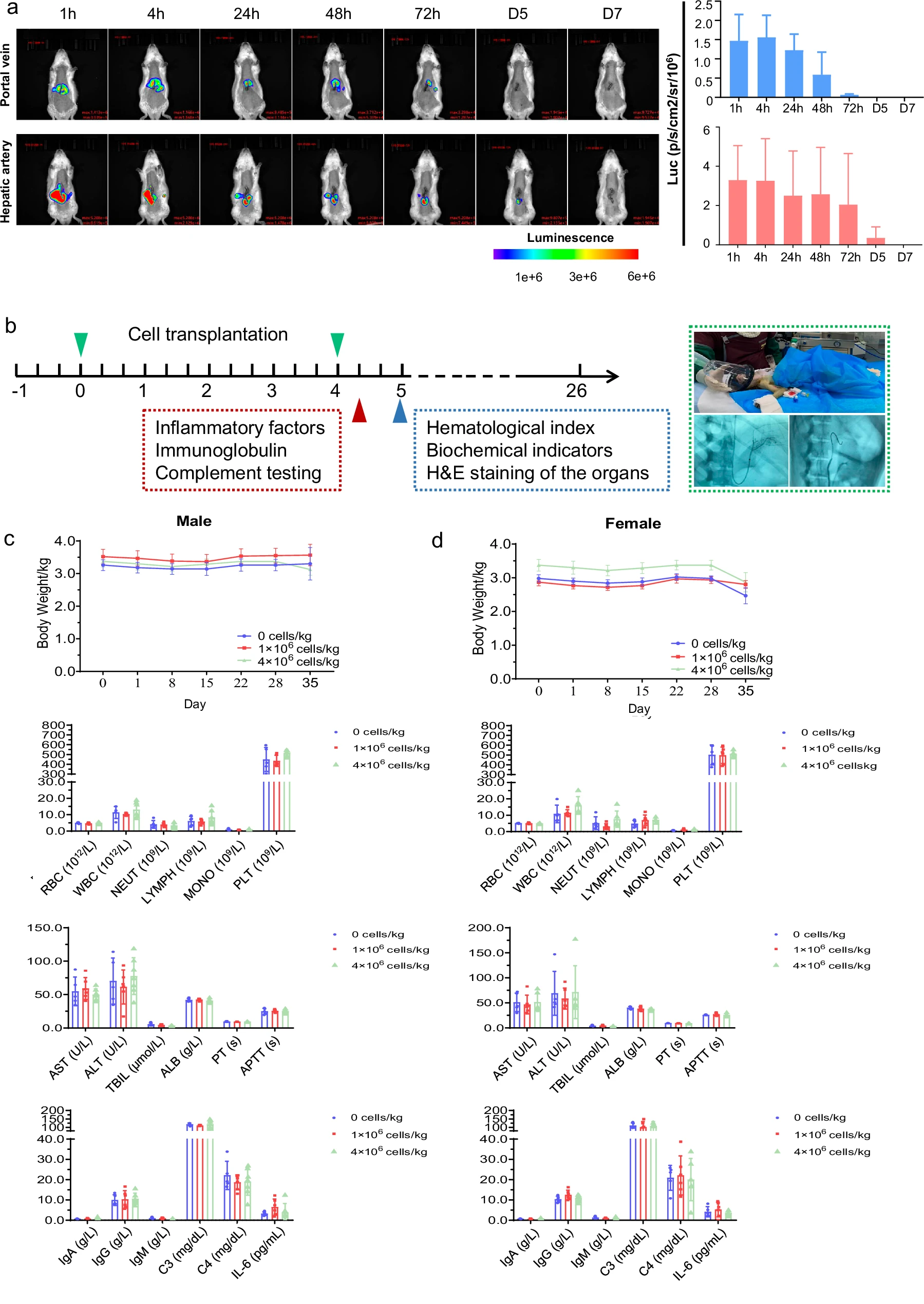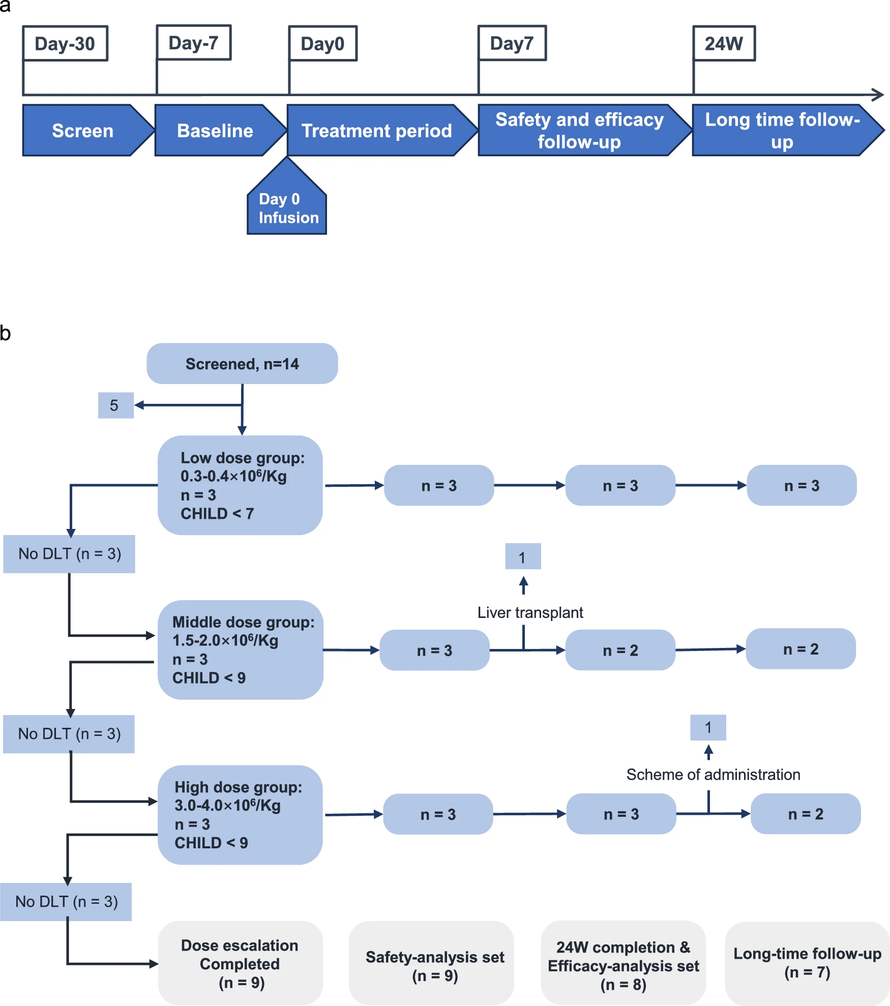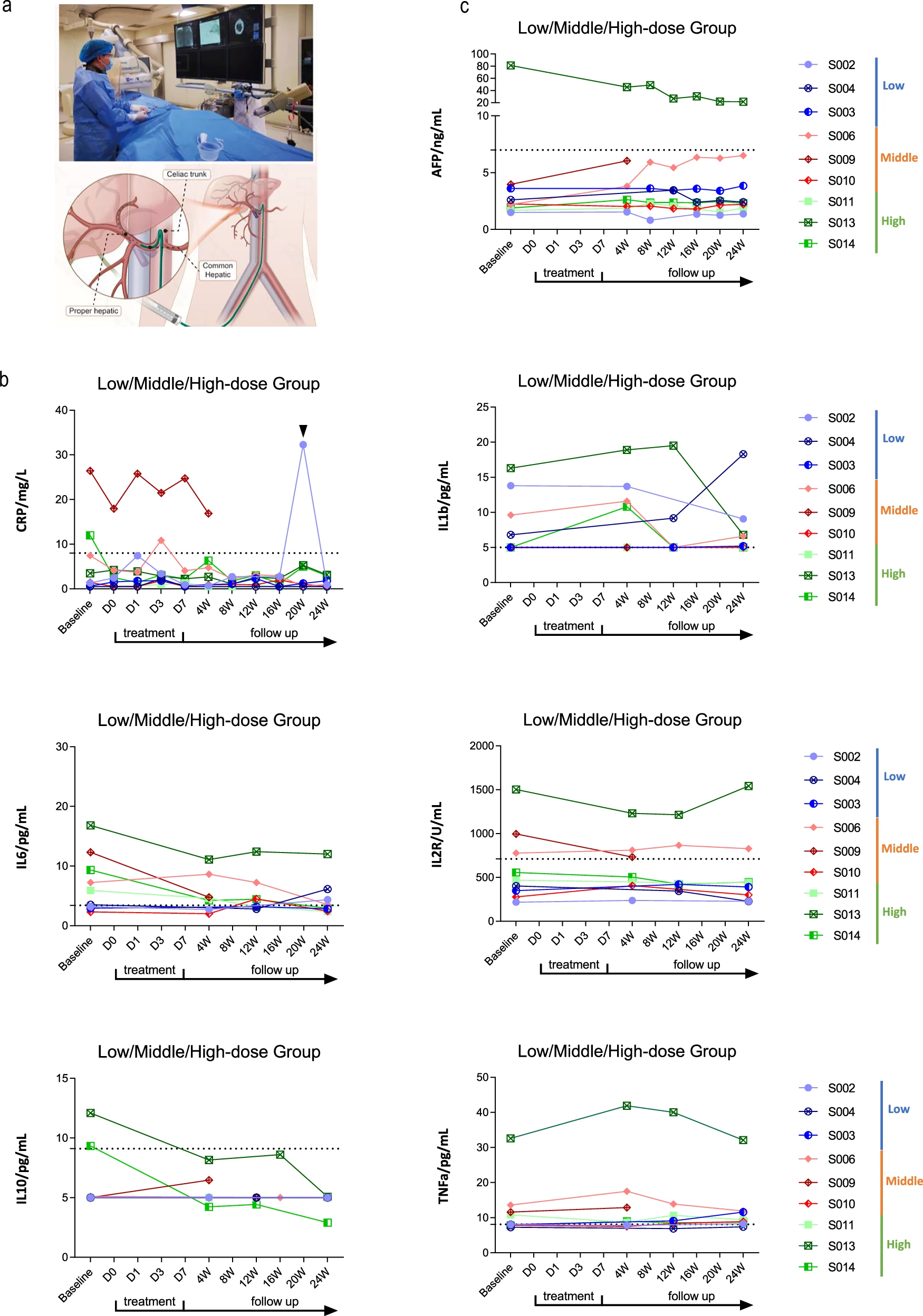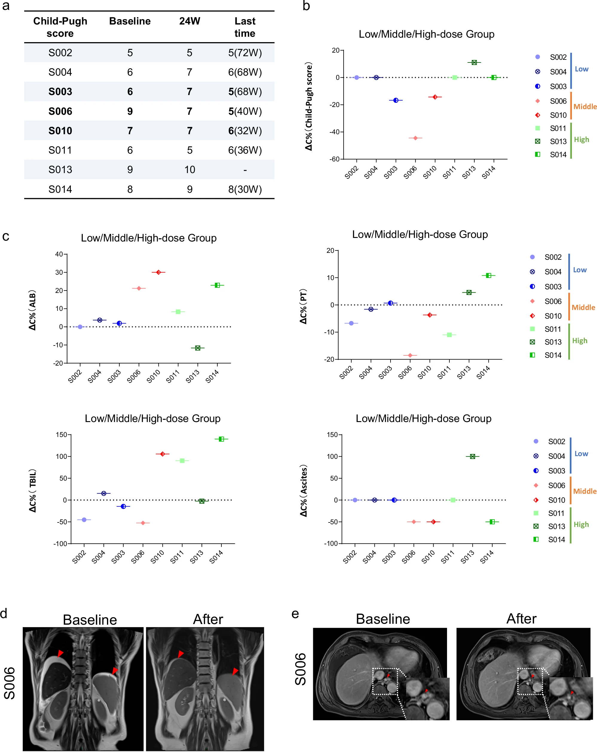 該研究在2021年12月27日至2022年12月14日期間,共招募并篩選了14例病因各異的肝硬化患者。其中9例患者接受了經(jīng)肝動脈輸注HepLPCs的治療,劑量遞增:低劑量組(0.3–0.4×10?/kg)、中劑量組(1.5–2.0×10?/kg)和高劑量組(3.0–4.0×10?/kg)(圖4、5a)。