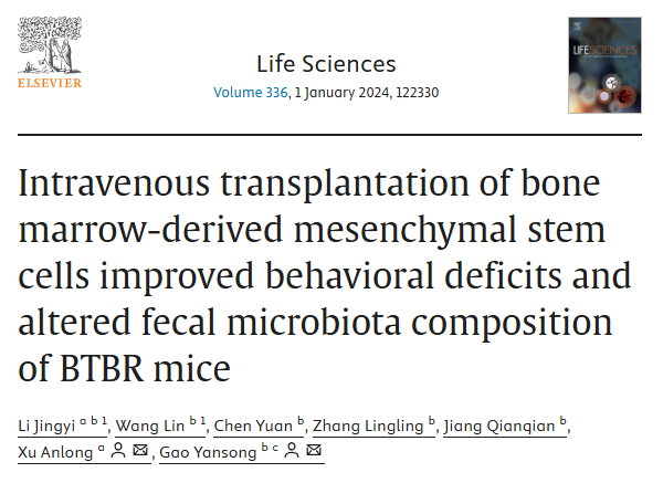 2023年12月3日,九芝堂美科在國際知名學術期刊《Life Sciences》發表研究論文《骨髓間充質干細胞靜脈移植改善BTBR小鼠的行為缺陷并糾正其糞便微生物群組成》,關于人骨髓間充質干細胞(hBMMSC)治療自閉癥的臨床前藥效學研究。