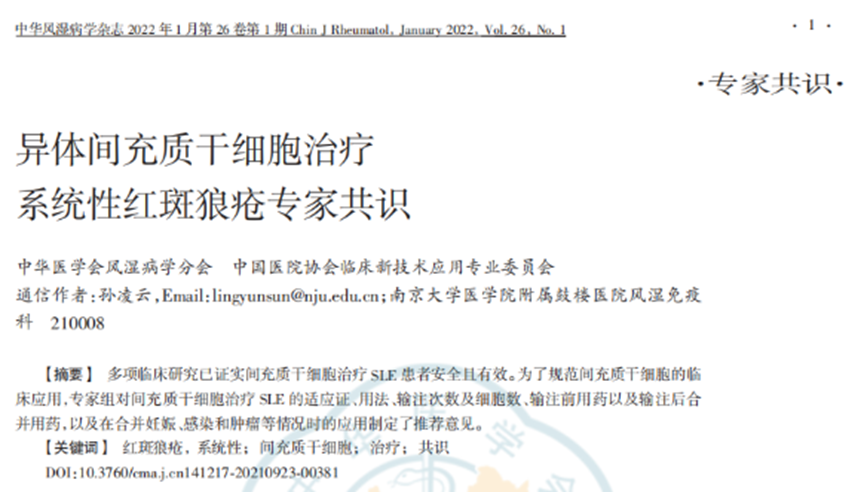 近年來,隨著臨床研究的進展,間充質干細胞(MSCs)已成為了系統性紅斑狼瘡的臨床新選擇。根據我國《中華風濕病學》雜志發表《異體間充質干細胞治療系統性紅斑狼瘡專家共識》(下稱《專家共識》),“多項臨床研究已證實間充質干細胞治療系統性紅斑狼瘡患者安全且有效。間充質干細胞治療大大提高了系統性紅斑狼瘡患者的療效,改善了系統性紅斑狼瘡患者的生存質量和預后。”