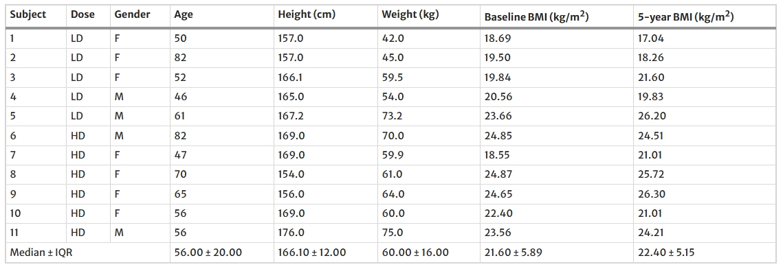 受試者的隨訪特征:所有11名健康志愿者(包括4名男性和7名女性)同意參加后續研究。其中,5名之前接受過低劑量 (LD) 的 CLV-100(6500萬個細胞),6名接受過高劑量 (HD) 的CLV-100(1.3億個細胞)(圖1)。在此次五年隨訪中,受試者的中位年齡為56±20歲,體質指數 (BMI) 為22.40±5.15kg/m2(表1)。人體測量數據顯示所有受試者均保持功能獨立、身體活躍和健康(表1)。值得注意的是,只有三名受試者略微超重,BMI>25kg/m2,兩名受試者從正常BMI轉為略微體重不足。