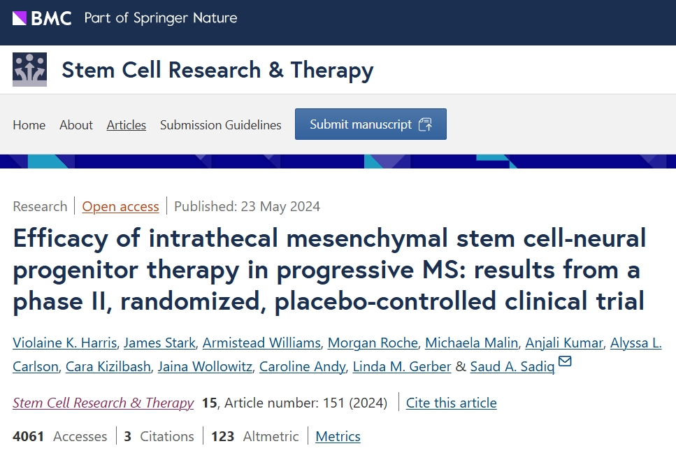 2024年,國際期刊雜志《干細胞研究與治療》發(fā)表了一篇“鞘內(nèi)間充質(zhì)干細胞-神經(jīng)祖細胞治療進展型多發(fā)性硬化癥的療效:II期隨機安慰劑對照臨床試驗結(jié)”的文章。