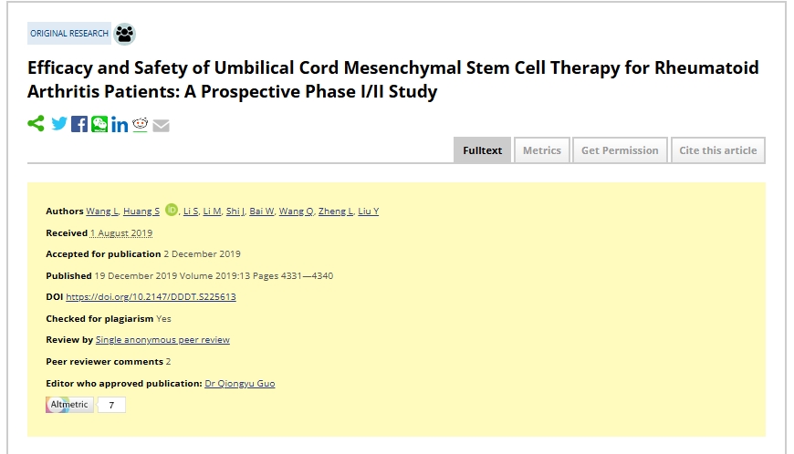 治療期間,患者在輸注100mL生理鹽水后立即通過靜脈注,40mLUC-MSC懸浮產(chǎn)品(2×10^7細胞/20mL)。使用血清學標志物測試來評估安全性,使用28關(guān)節(jié)疾病活動評分 (DAS28) 和健康評估問卷 (HAQ) 來評估UC-MSCs治療RA的長期效果和安全性。研究結(jié)果發(fā)表在《Dove Press》。