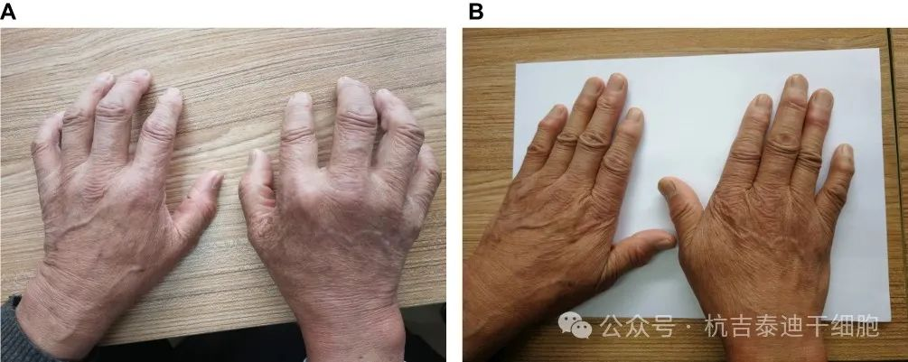 第一位患者是一位68歲的男性,治療前關(guān)節(jié)疼痛、腫脹、變形嚴重,接受UC-MSC治療6個月后癥狀得到緩解,并維持至治療后3年(圖1A)。接受UC-MSC治療3年后,關(guān)節(jié)變形得到恢復(圖1B),疼痛也消失了,并且能夠自由活動和進行一些體育鍛煉。