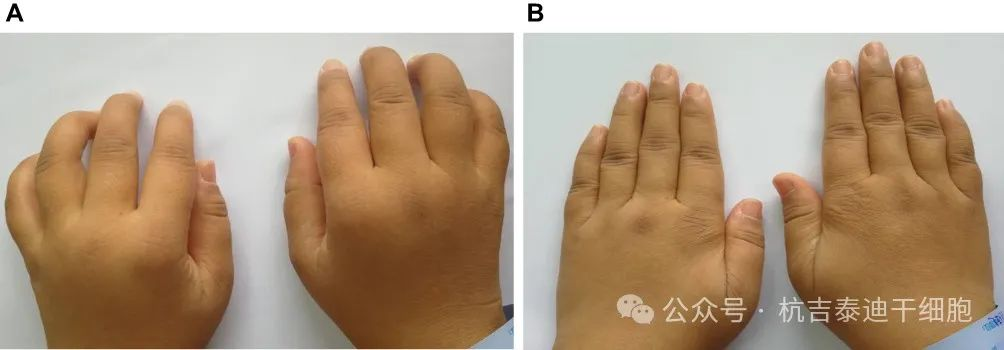 另一名33歲女性類風濕性關(guān)節(jié)炎患者,治療前關(guān)節(jié)腫脹及畸形較為嚴重(圖2A),治療后病情也獲得緩解。接受UC-MSC治療三年后,其關(guān)節(jié)畸形得到改善(圖2B),腫脹也得到較好的緩解。此外,她現(xiàn)在有時可以自由奔跑和進行一些體育鍛煉。