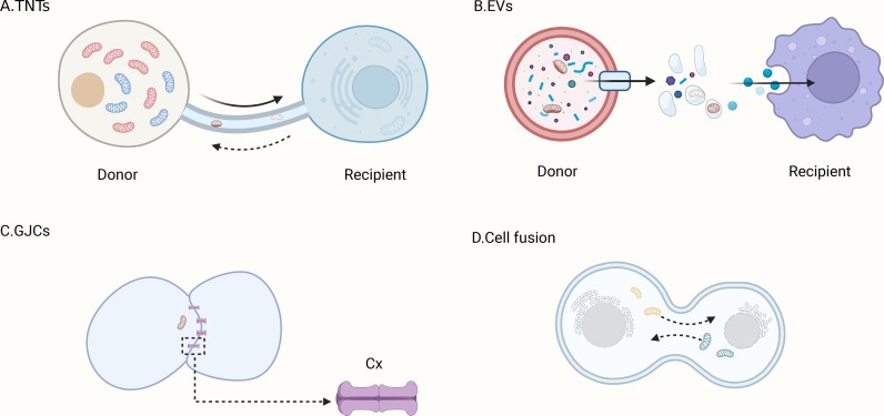 A. TNT 是一種膜狀管狀突起,從質膜延伸出來,連接兩個細胞形成開放通道。TNT 是連接細胞之間 MT 最常見的路徑。B. 據報道,由細胞質膜起泡形成的 EVs 是 MT 的另一種路徑。C. GJC 介導的 MT 模式尚不明確。可能的機制是供體細胞的突起中存在線粒體,受體細胞通過內陷 JCs 連接到供體細胞。然后,受體細胞內化 JCs 并吸收線粒體。D. 細胞融合共享細胞質成分和細胞器,包括線粒體。