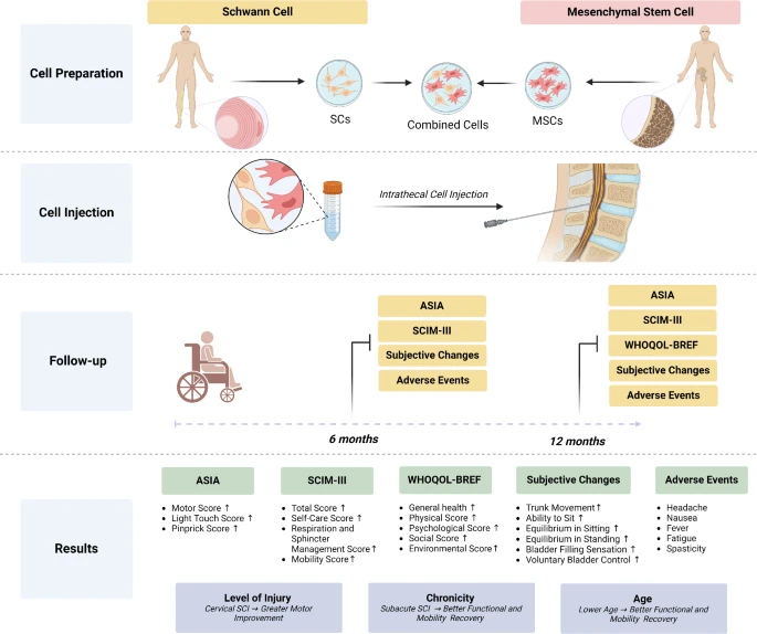 研究評估了安全性,并使用美國脊髓損傷協會(ASIA)評分、脊髓獨立性測量量表(SCIM-III)和世界衛生組織生活質量量表簡版(WHOQOL-BREF)在注射后6個月和12個月測量了患者的神經系統和功能結局。并進行了多元回歸分析,以評估與結局相關的因素。