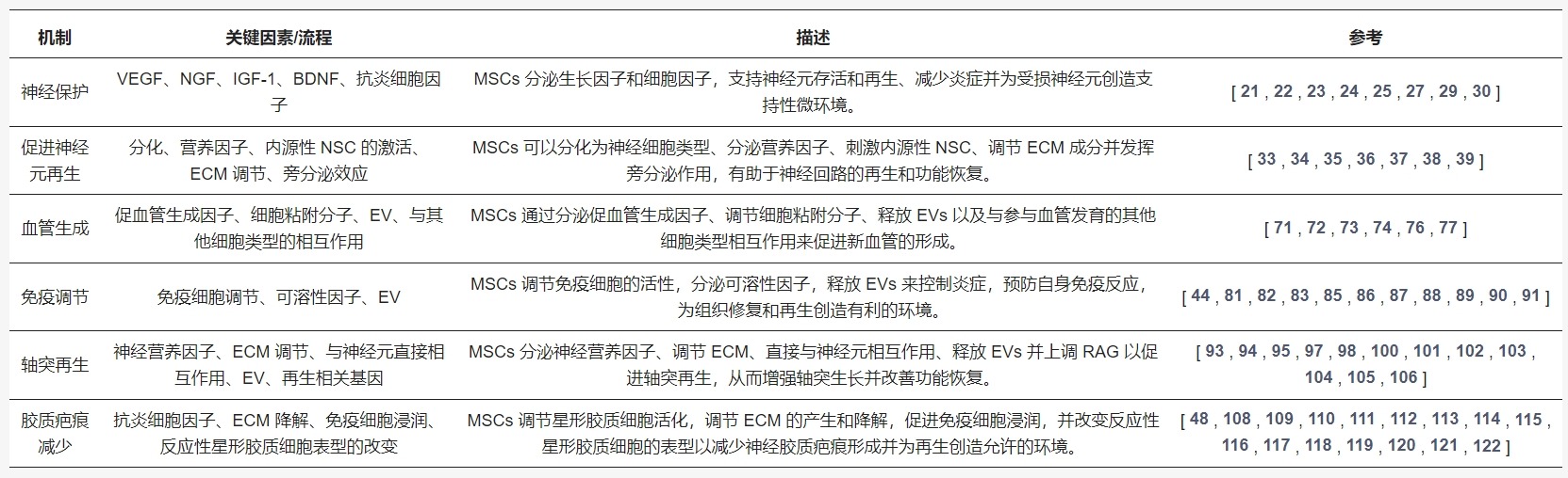 MSCs通過各種機制促進神經元再生,包括它們分化成神經細胞類型的能力、營養因子的分泌、內源性NSCs的刺激、ECM成分的調節和旁分泌作用。MSC的這些協同作用有助于SCI后神經回路的恢復和功能恢復。