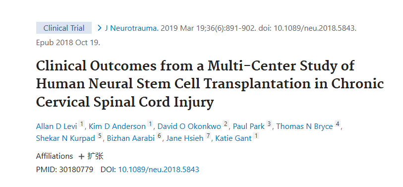 2019年3月19日,邁阿密大學(xué)米勒醫(yī)學(xué)院在國際期刊《Journal of Neurotrauma》上發(fā)布了一篇《人類神經(jīng)干細(xì)胞移植治療慢性頸脊髓損傷的多中心研究的臨床結(jié)果》的研究結(jié)果。