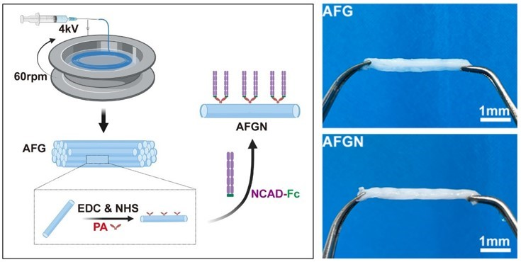 神經(jīng)干細(xì)胞聯(lián)合水凝膠材料:2023年4月,清華大學(xué)材料學(xué)院王秀梅團(tuán)隊(duì)和北京清華長庚醫(yī)院神經(jīng)外科王貴懷團(tuán)隊(duì)通過醫(yī)工交叉合作,開發(fā)了一種新型的N-鈣粘蛋白(NCAD)修飾的功能化定向納米纖維水凝膠(AFGN),為NSC“量身定制”適宜的遞送和生長微環(huán)境,聯(lián)合治療脊髓損傷(如下圖)。