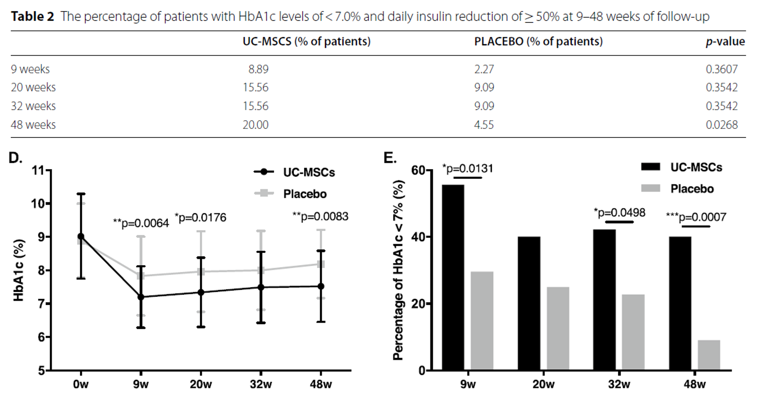 經過48周的治療周期后,研究團隊發現,接受間充質干細胞(UC-MSCs)治療的2型糖尿病患者中,有20%的患者的糖化血紅蛋白(HbA1c)水平成功降至7.0%以下,并且他們的日均胰島素用量減少了超過一半。相比之下,僅接受安慰劑治療的患者中,僅有4.55%達到了這一血糖控制目標。兩組之間的這一差異在統計學上被認為是顯著的。