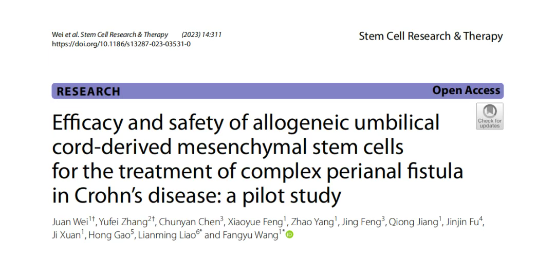 [3]Wei, J., Zhang, Y., Chen, C. et al. Efficacy and safety of allogeneic umbilical cord-derived mesenchymal stem cells for the treatment of complex perianal fistula in Crohn’s disease: a pilot study. Stem Cell Res Ther 14, 311 (2023). https://doi.org/10.1186/s13287-023-03531-0