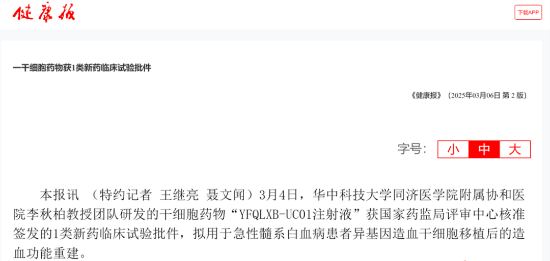 2025年3月4日,該院李秋柏教授團(tuán)隊研發(fā)的干細(xì)胞藥物“YFQLXB-UC01注射液”成功獲得國家藥監(jiān)局評審中心核準(zhǔn)簽發(fā)的1類新藥臨床試驗批件(受理號:CXSL2400857),擬用于急性髓系白血病(AML)患者異基因造血干細(xì)胞移植(allo-HSCT)后的造血功能重建。此次獲批不僅是國家重點(diǎn)研發(fā)計劃干細(xì)胞專項的首個臨床新藥突破,也是華中科技大學(xué)附屬協(xié)和醫(yī)院研發(fā)計劃團(tuán)隊在干細(xì)胞IND新藥領(lǐng)域的里程碑進(jìn)展。